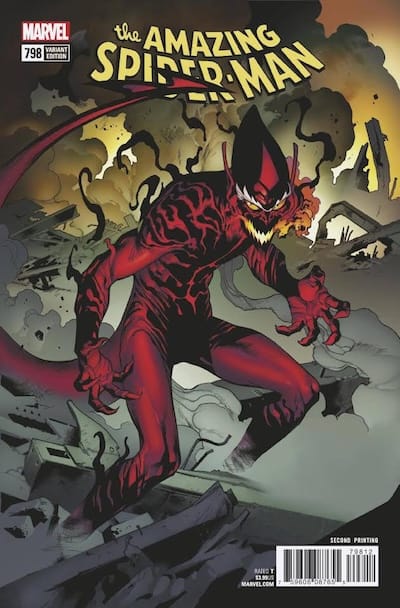 But I opened it just now and scrolled through the most recent issues. A couple of characters had become zombies. A couple were possessed by demons or cosmic entities. A few had swapped costumes: X-23 is calling herself Sabretooth, and a version of the old X-Men enemy Wendigo is wearing the Wolverine costume. The Green Goblin is in a Spider-Man suit. Eddie Brock, best known as the human identity of Venom, has become Carnage. The human in the Venom suit is currently Mary Jane Watson, former Spider-spouse. Dr Strange lives in Asgard now.