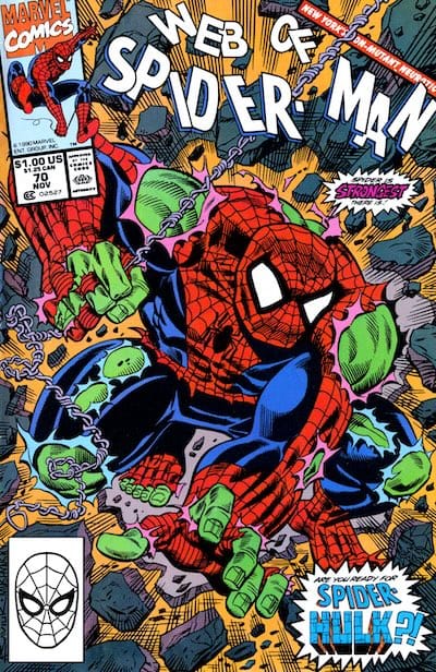 Spider-Hulk, a one-off character mashup that appeared for two issues in the 90s. This sort of thing is now one of Marvel's two standard storylines, the other being revivals of old crossovers, like Age of Apocalypse. Art and characters (c) Marvel.